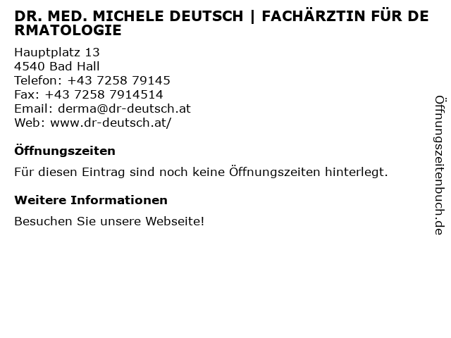 | DR. MED. MICHELE DEUTSCH | FACHÄRZTIN FÜR DERMATOLOGIE anrufen | |