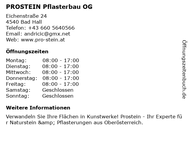 | Öffnungszeiten PROSTEIN Pflasterbau OG in Bad Hall anzeigen | |