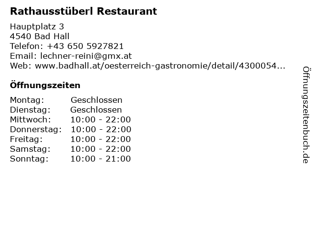 | Telefonnummer Rathausstüberl Restaurant in Bad Hall (+43 650 5927821) anrufen | |