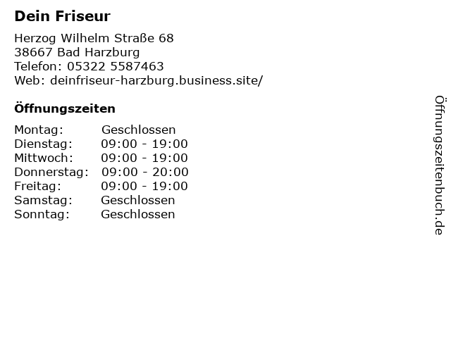| Öffnungszeiten Dein Friseur in Bad Harzburg anzeigen | |