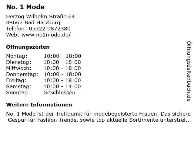| Öffnungszeiten No. 1 Mode in Bad Harzburg anzeigen | |