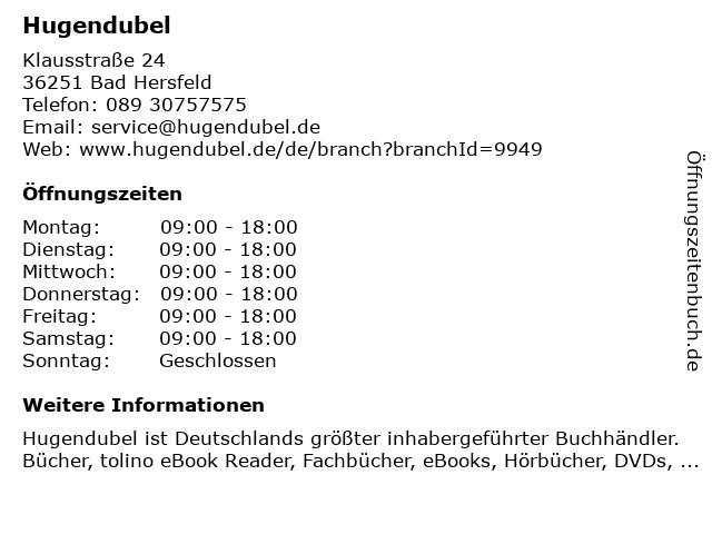 | Öffnungszeiten Hugendubel in Bad Hersfeld anzeigen | |