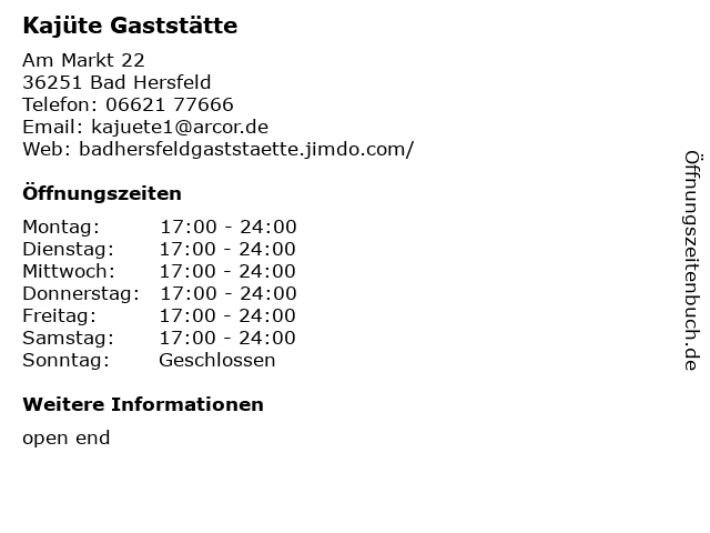 | Öffnungszeiten Kajüte Gaststätte in Bad Hersfeld anzeigen | |