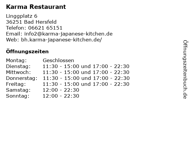 | Öffnungszeiten Karma Restaurant in Bad Hersfeld anzeigen | |