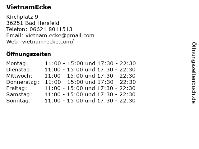 | Öffnungszeiten VietnamEcke in Bad Hersfeld anzeigen | |