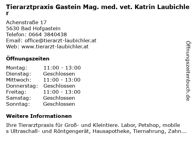 Branchen & Suchbegriffe zu Tierarztpraxis Gastein Mag. med. vet. Katrin Laubichler:gastein, katrin, laubichler, mag., med., tierarztpraxis, vet. |