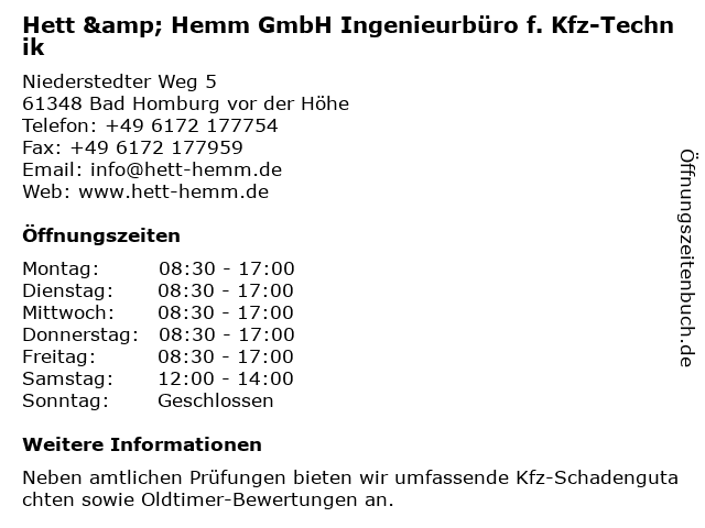 1 Ing.-Büro für KFZ-Technik Hett & Hemm GmbH (Entfernung: 0,20 km) Niederstedter Weg 5, 61348 Bad Homburg 2 Michael Mühlhausen Zwei M Event & Technik (Entfernung: 0,92 km) Bommersheimer Weg 24, 61348 Bad Homburg 3 Büro für Kfz.-Technik Pristaff & Rottländer GmbH (Entfernung: 1,04 km) Zeilweg 6, 61440 Oberursel (Taunus) 6 |