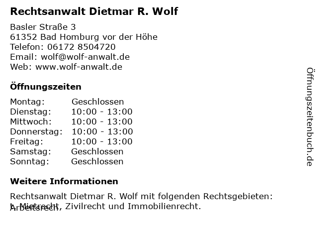 Branchen & Suchbegriffe zu Rechtsanwalt Dietmar R. Wolf:dietmar, r., rechtsanwalt, wolf |