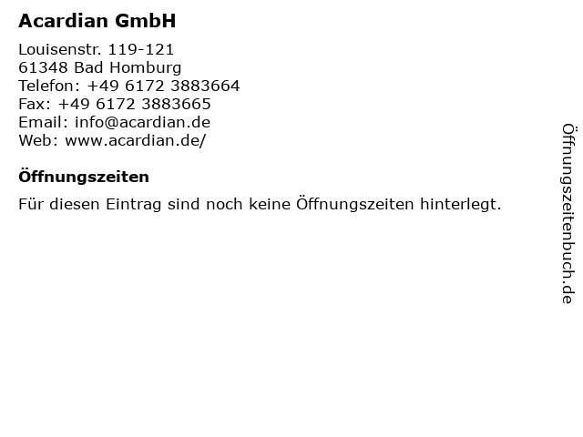 | Öffnungszeiten Acardian GmbH in Bad Homburg anzeigen | |