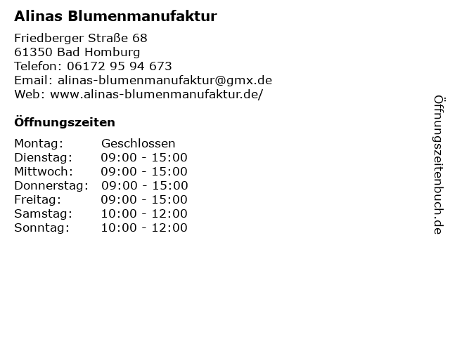| Öffnungszeiten Alinas Blumenmanufaktur in Bad Homburg anzeigen | |