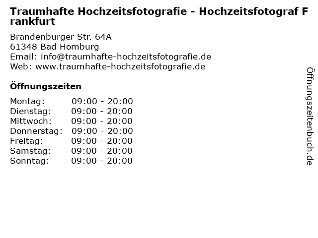 | Öffnungszeiten Traumhafte Hochzeitsfotografie - Hochzeitsfotograf Frankfurt in Bad Homburg anzeigen | |