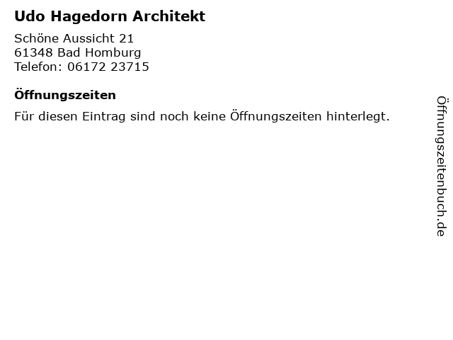 | Öffnungszeiten Udo Hagedorn Architekt in Bad Homburg anzeigen | |