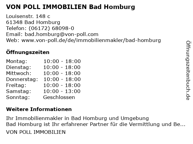1 VON POLL FINANCE Baufinanzierung unabhängig aus 400 Banken! (Entfernung: 0,08 km) Am Hohlebrunnen 1, 61352 Bad Homburg 2 von Poll Immobilien GmbH (Frankfurt) (Entfernung: 7,94 km) Eschersheimer Landstr. 537, 60431 Frankfurt 3 von Poll Immobilien - Immobilienshop Detlef Krebs (Entfernung: 7,94 km) Eschersheimer Landstraße 537, 60431 Frankfurt am Main 6 |