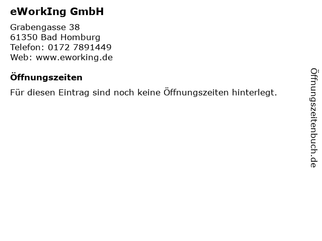 | Öffnungszeiten eWorkIng GmbH in Bad Homburg anzeigen | |