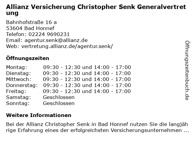 1 Allianz Versicherung Hans Kluge Generalvertretung (Entfernung: 0,38 km) Rathausplatz 16, 53604 Bad Honnef 3 i-Thera Praxis für Psychotherapie J. Christopher Kübler, lic.phil. (Klinischer Psychologe) (Entfernung: 3,02 km) Mühlenstr. 21, 53343 Wachtberg 4 Allianz Versicherung Lothar Bonn und Fernando Poyatos Sedano Generalvertretung (Entfernung: 6,92 km) Kölner Straße 7, 53579 Erpel 5 AXA Versicherung - Generalvertretung Erwin Reufels (Entfernung: 7,14 km) Kalenborner Straße 72, 53560 Vettelschoß 6 AXA Versicherung - Generalvertretung Peter Boucsein (Entfernung: 11,93 km) Adenauerallee 124, 53113 Bonn |