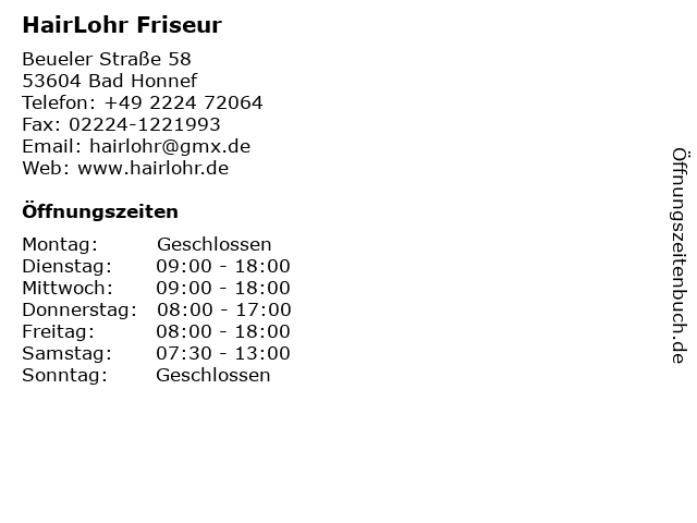| Öffnungszeiten HairLohr Friseur in Bad Honnef anzeigen | |
