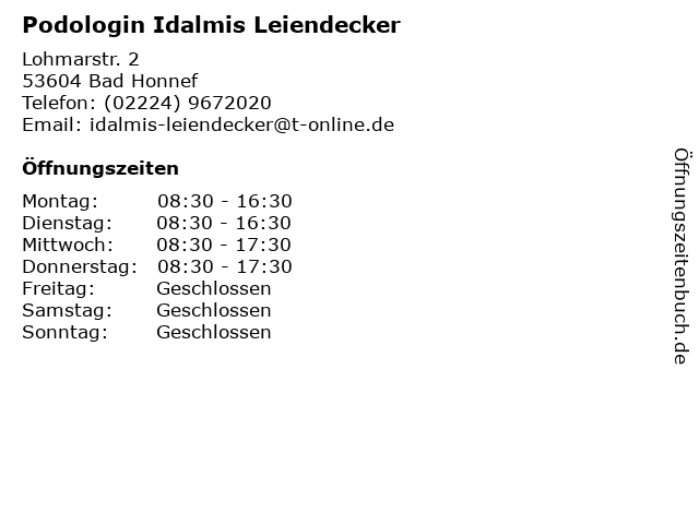 1 Rosa-Maria Mandelkow Podologin med.Fußpflege (Entfernung: 5,19 km) Im Born 8, 53572 Bruchhausen, Westerwald 4 Günter Vreden Podologische Medizinische Fußpflege (Entfernung: 0,41 km) Bahnhofstr. 5, 53604 Bad Honnef 6 |
