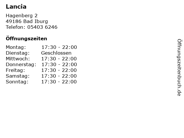 | Öffnungszeiten Lancia in Bad Iburg anzeigen | |