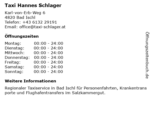 | Öffnungszeiten Taxi Hannes Schlager in Bad Ischl anzeigen | |