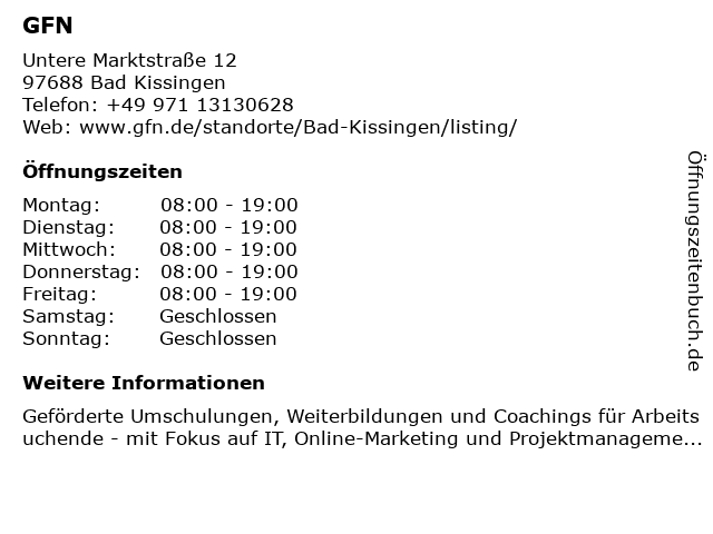 | Öffnungszeiten GFN in Bad Kissingen anzeigen | |