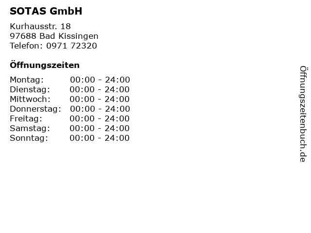 | Öffnungszeiten SOTAS GmbH in Bad Kissingen anzeigen | |
