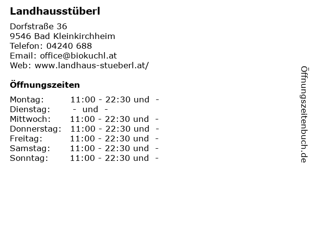 | Öffnungszeiten Landhausstüberl in Bad Kleinkirchheim anzeigen | |
