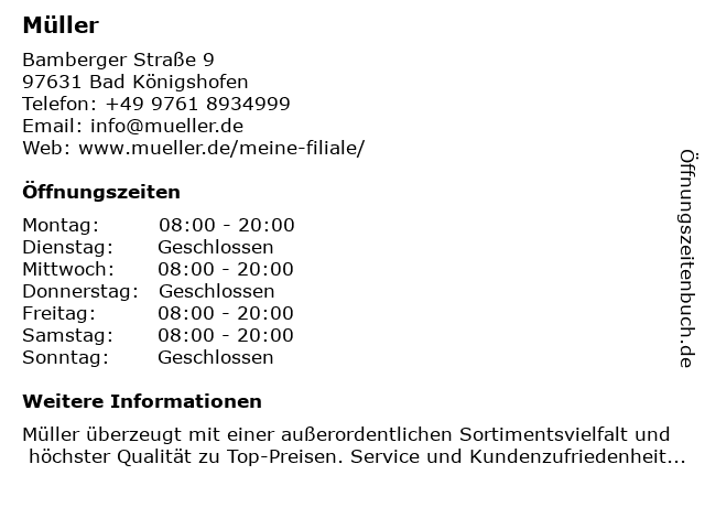 | Öffnungszeiten Müller in Bad Königshofen anzeigen | |