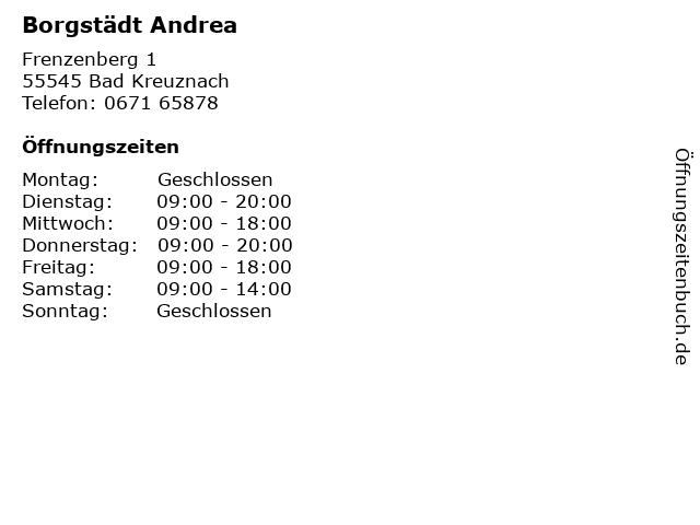 | Öffnungszeiten Borgstädt Andrea in Bad Kreuznach anzeigen | |