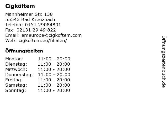 | Öffnungszeiten Cigköftem in Bad Kreuznach anzeigen | |