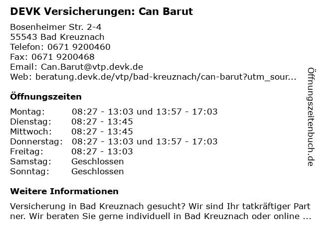 2 DEVK Versicherung Barbara Christian Bereichsleiterin (Entfernung: 0,04 km) Bosenheimer Straße 2-4, 55543 Bad Kreuznach 3 DEVK Versicherung: Daniel Kleikemper (Berater*in ausgeschieden) (Entfernung: 2,98 km) Bosenheimer Str. 16, 55546 Hackenheim 6 DEVK Versicherungen: Alberto Bruno (Berater*in ausgeschieden) (Entfernung: 13,98 km) Koblenzer Straße 23, 55411 Bingen |