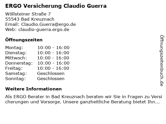| Öffnungszeiten ERGO Versicherung Claudio Guerra in Bad Kreuznach anzeigen | |