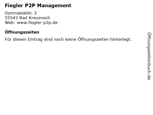 | Öffnungszeiten Fiegler P2P Management in Bad Kreuznach anzeigen | |