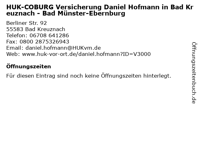 | HUK-COBURG Versicherung Daniel Hofmann in Bad Kreuznach - Bad Münster-Ebernburg anrufen | |