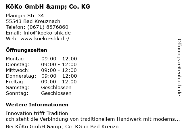 | Öffnungszeiten KöKo GmbH & Co. KG in Bad Kreuznach anzeigen | |