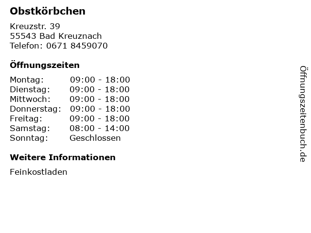 | Öffnungszeiten Obstkörbchen in Bad Kreuznach anzeigen | |