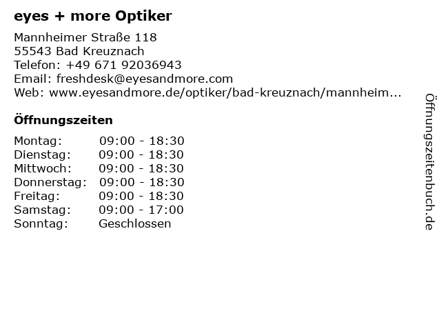 | Öffnungszeiten eyes + more Optiker in Bad Kreuznach anzeigen | |