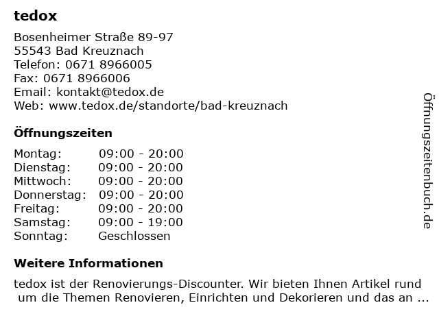 | Öffnungszeiten tedox in Bad Kreuznach anzeigen | |
