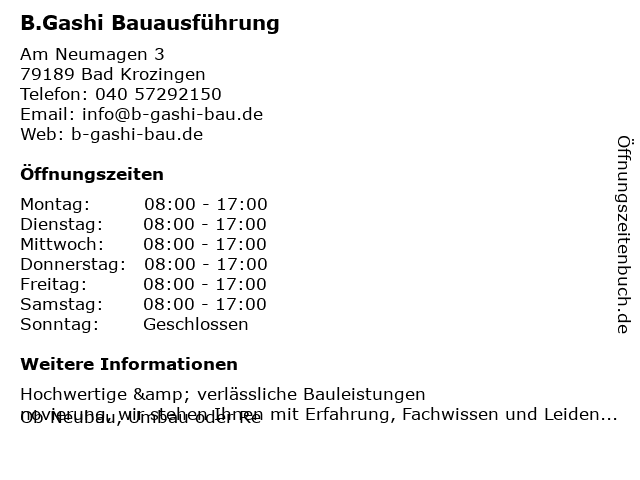 | Öffnungszeiten B.Gashi Bauausführung in Bad Krozingen anzeigen | |