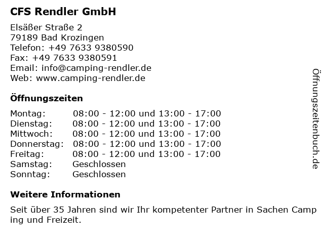 | Öffnungszeiten CFS Rendler GmbH in Bad Krozingen anzeigen | |