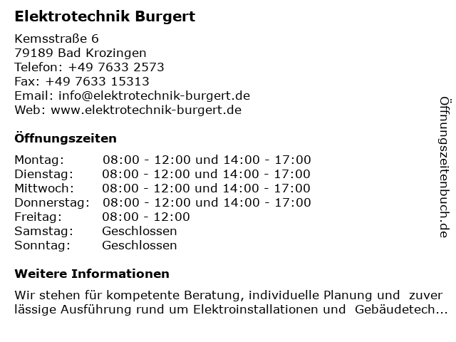 | Öffnungszeiten Elektrotechnik Burgert in Bad Krozingen anzeigen | |
