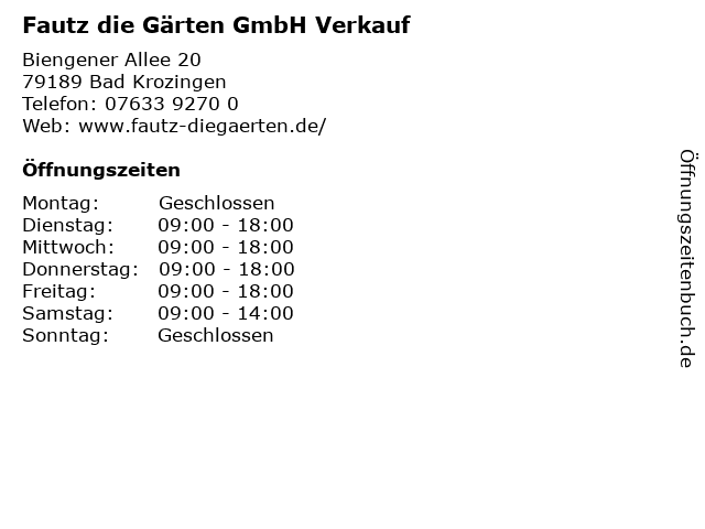 1 Fautz die Gärten GmbH Garten- und Landschaftsbau (Entfernung: 0,08 km) Biengener Allee 20, 79189 Bad Krozingen 5 FAUTZ Beschichtungen GmbH Malerbetrieb - Bautenschutz (Entfernung: 46,63 km) Vorbächstr. 20, 77796 Mühlenbach 6 |
