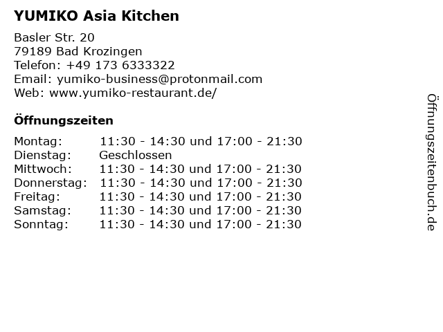 | Öffnungszeiten YUMIKO Asia Kitchen in Bad Krozingen anzeigen | |