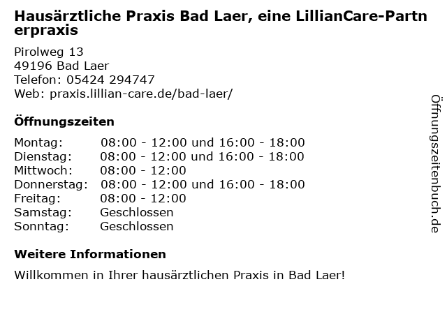 Branchen & Suchbegriffe zu Hausärztliche Praxis Bad Laer, eine LillianCare-Partnerpraxis:allgemeinärzte, bad, eine, hausärztliche, laer, lilliancare, medizinisches fachpersonal, partnerpraxis, praxis |