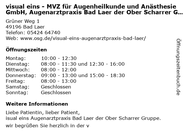 Branchen & Suchbegriffe zu visual eins - MVZ für Augenheilkunde und Anästhesie GmbH, Augenarztpraxis Bad Laer der Ober Scharrer Gruppe:anästhesie, augenarztpraxis, augenheilkunde, bad, eins, gruppe, laer, mvz, ober, scharrer, visual |