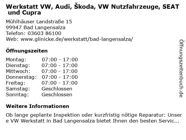 1 VW + Audi Autohaus Glinicke Bad Langensalza (Entfernung: 0,05 km) Mühlhäuser Landstraße 15, 99947 Bad Langensalza 2 Schade GmbH & Co. KG (Service Nutzfahrzeuge) (Entfernung: 14,07 km) Am Felchtaer Bach 99, 99974 Mühlhausen 3 Schade GmbH & Co. KG (Verkauf Nutzfahrzeuge) (Entfernung: 14,07 km) Am Felchtaer Bach 99, 99974 Mühlhausen 6 |