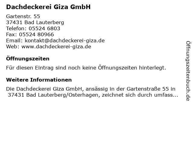 | Öffnungszeiten Dachdeckerei Giza GmbH in Bad Lauterberg anzeigen | |