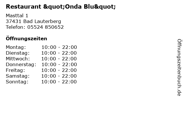 | Öffnungszeiten Restaurant "Onda Blu" in Bad Lauterberg anzeigen | |