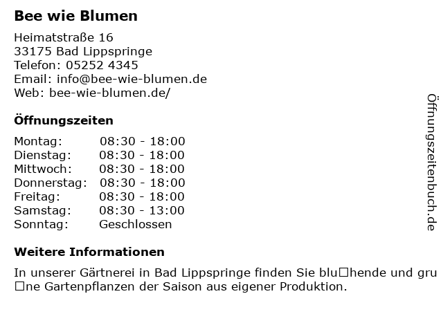 | Öffnungszeiten Bee wie Blumen in Bad Lippspringe anzeigen | |