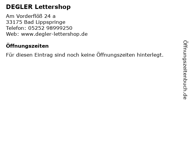 | Öffnungszeiten DEGLER Lettershop in Bad Lippspringe anzeigen | |