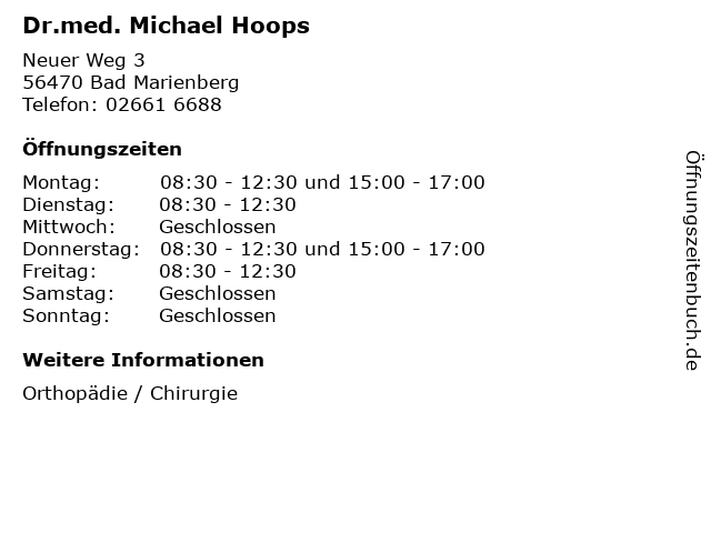 | Öffnungszeiten Dr.med. Michael Hoops in Bad Marienberg anzeigen | |